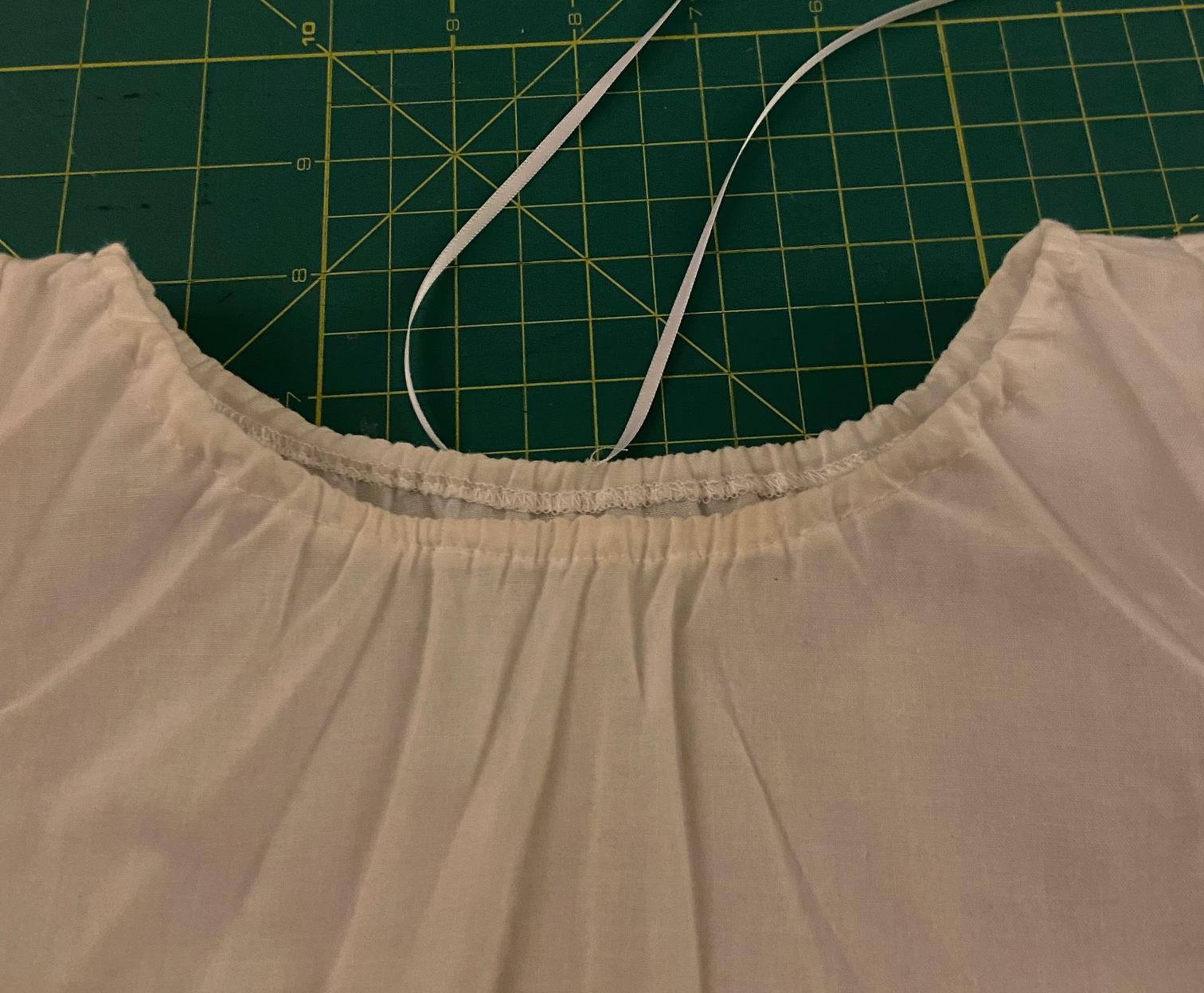 I simply threaded the needle with ribbon, pushed the needle into the hole, pulled it the whole way around the collar, and back out through the hole. A drawstring may not seem like an ideal solution, but it's easy to use, it's closer to what could have been done in period, AND it never stretches out the way elastic does!